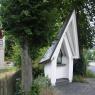 Der Entwurfsgedanke war, ein Heiligenhaus zu entwerfen, welches für jung und alt in einer gleichen Bedeutung stehen soll. Da kam mir die "heilige Dreifaltigkeit" in den Sinn. Das Heiligenhaus sollte sich von den allgemeinen, üblichen und bestehenden Formen hervor heben. Es mußte eine Form sein, die auch etwas modern ist, weil sich die jüngeren Menschen mehr mit dem modernen identifizieren können. Daraus ergab sich als Grundrissfläche eine "dreieckige" Fläche. Im übrigen sollten sich dann auch in der Ansicht wie auch beim Dach keine normale "viereckige" Fläche entstehen, sondern sich auch der im Grundriss vorkommenden Fläche wiederspiegeln.